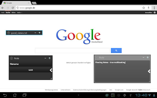 Floating Notes is a note application that allows you to view and edit notes in up to 4 wi ndows. The w indows hover over any other application. This is true multi-tasking! Browse the web, watch a video ... while taking a note with Floating Notes!